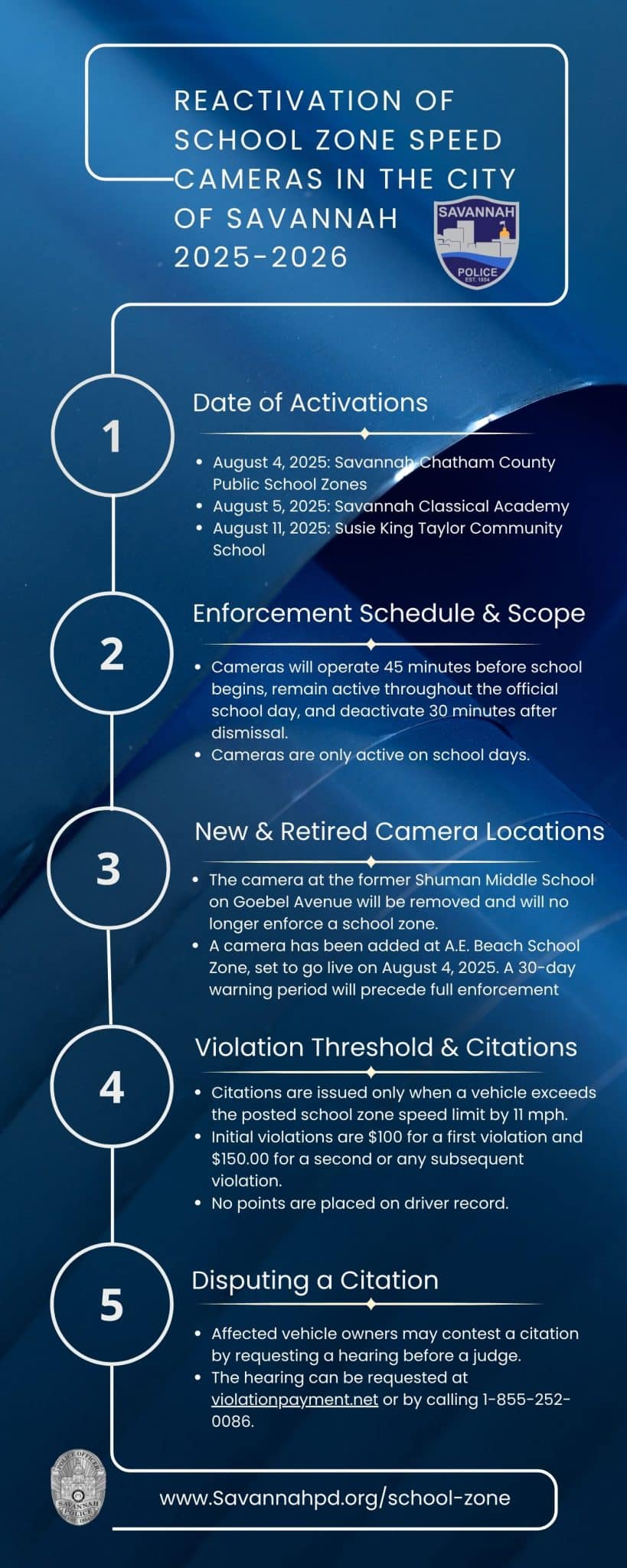 Below, you will find school zone locations and times cameras are active, as well as updated information regarding reactivation details, speed data, academic calendars, and how to contest a civil violation.